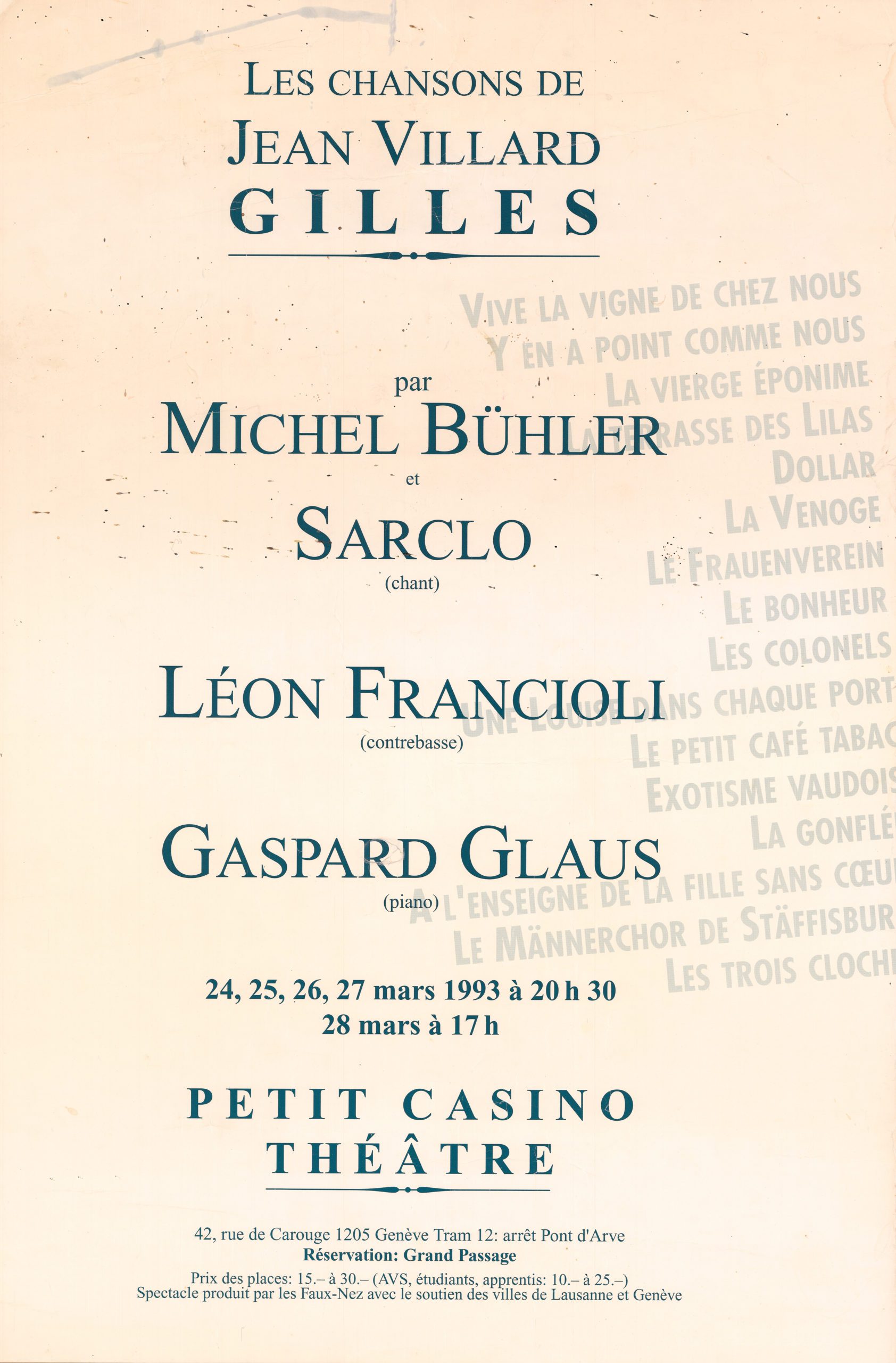 1993. Spectacle au Faux-Nez à Lausanne « Sarclo et Bühler chantent Jean Villard Gilles », accompagnés par Léon Francioli et Gaspard Glaus.